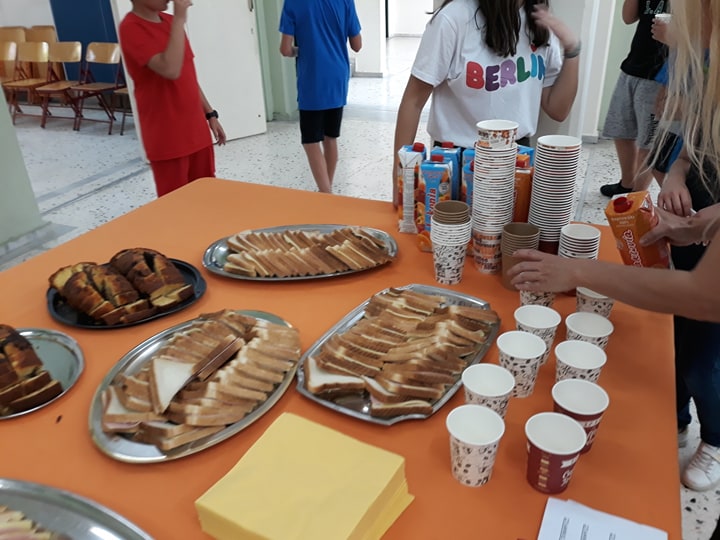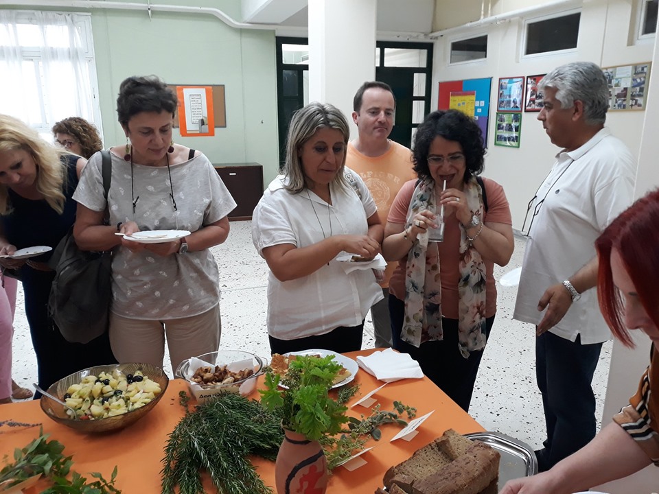 Τους συναδέλφους εκπαιδευτικούς τους υποδεχτήκαμε με χειροποίητα κεράσματα με συστατικά από λαχανικά του κήπου μας και με εύγεστα αφεψήματα από τα αρωματικά μας. Οι μαθητές μας τους δώρισαν καραβάκια με δεντρολίβανο, αρμπαρόριζα και ρίγανη, όπου επάνω τους είχαν qr code, που οδηγούν (με qr code reader από κινητή συσκευή) στην ιστοσελίδα μας με συνταγές και γιατροσόφια από διάφορα αρωματικά φυτά από το βιβλίο της Ελληνικής Εταιρείας Προστασίας της Φύσης αλλά και στο βραβευμένο βίντεο.